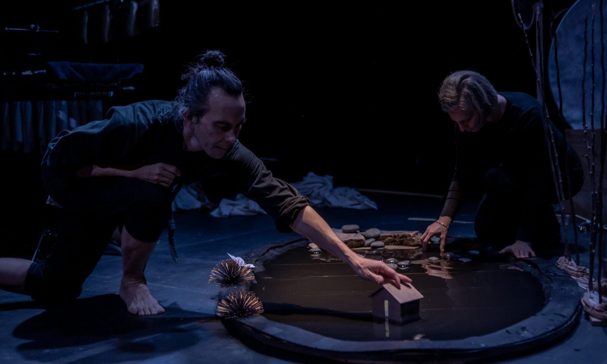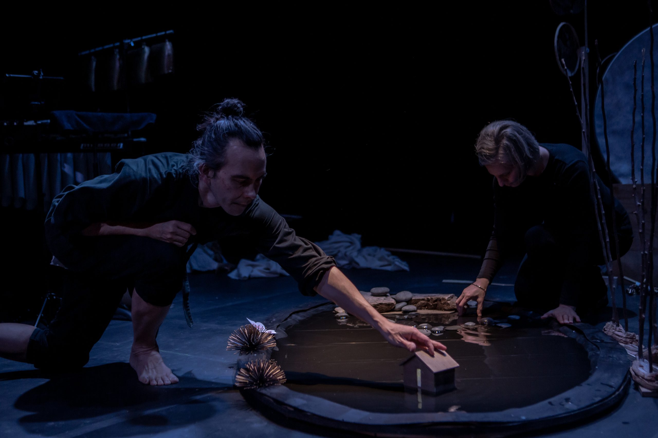 The story is about paths crossing. A medieval astronomer and his assistant track a comet across the heavens; a swordsman turns bandit out of grief. All wander up mountains, into snowstorms and eventually, through time. To the sounds of hammer dulcimer and flute, a golden goddess occasionally sends down emissaries, like the enormous wooden stag who fixes the audience with her black gaze. A complicated model set, filmed and projected as live scenery, turns the small room into a cabinet of wonders… Helen Shaw, TimeOut NY